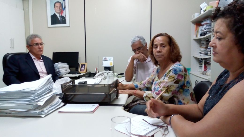 A presidente Ivanilda Brito, a vice-presidente Tereza Deiró, a diretora Laurinda Lula Machado e presidente do Sindimed Francisco Magalhães se reuniram com o superintendente de RH da Saeb Adriano Tambone, nesta segunda (12/3), para discutirem demandas dos servidores da Sesab.