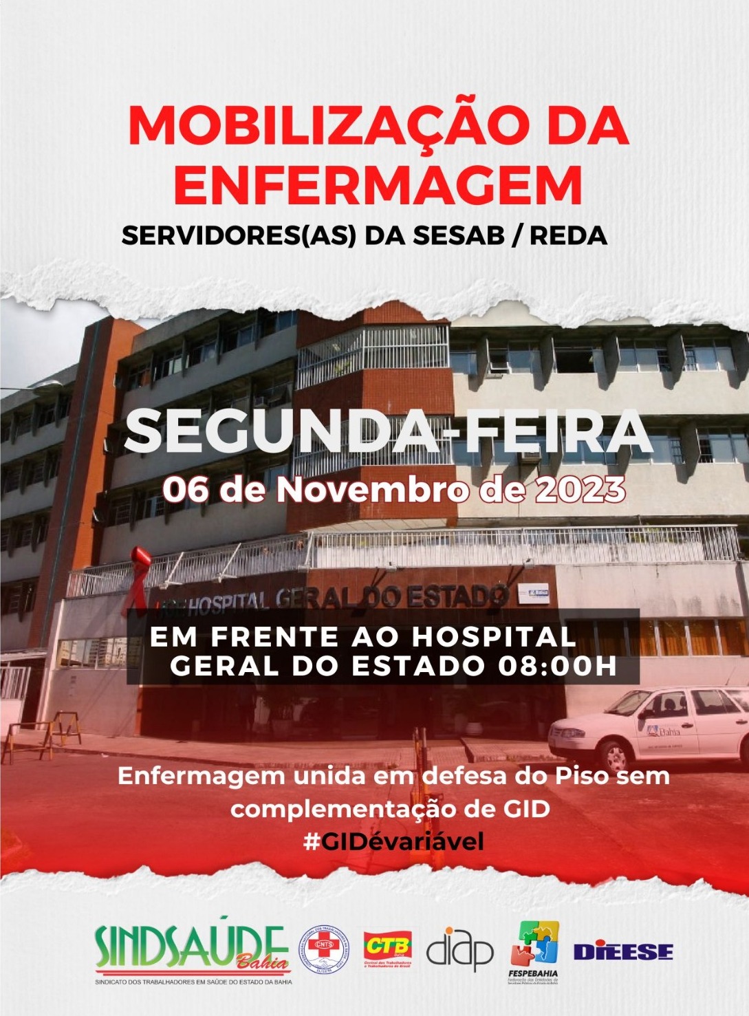Agora acontece no dia 06 de novembro, às 8horas, na porta do Hospital Geral do Estado da Bahia (HGE), com objetivo de mobilizar a todos(as), em defesa do Piso da Enfermagem sem complementar com a GID;