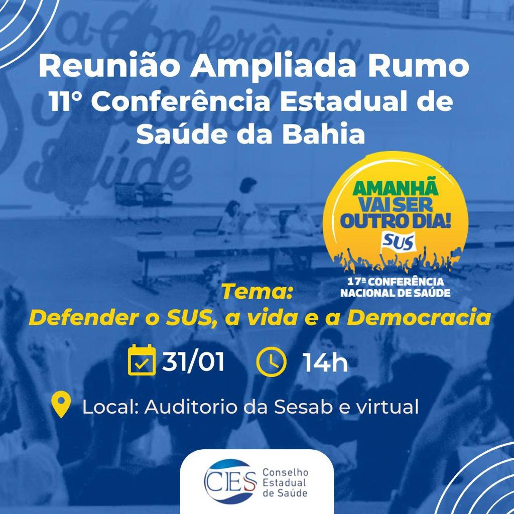 Em virtude da proximidade da 11ª Conferência Estadual de Saúde da Bahia e da 17ª Conferência Nacional da Saúde, o Conselho Estadual de Saúde da Bahia convida os Movimentos Sociais, Conselheiras/os Municipais, Trabalhadoras/es, Prestadoras/es e Gestoras/es dos Serviços da Saúde, para participar da Reunião Ampliada Rumo 11ª Conferência Estadual de Saúde da Bahia.