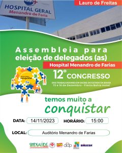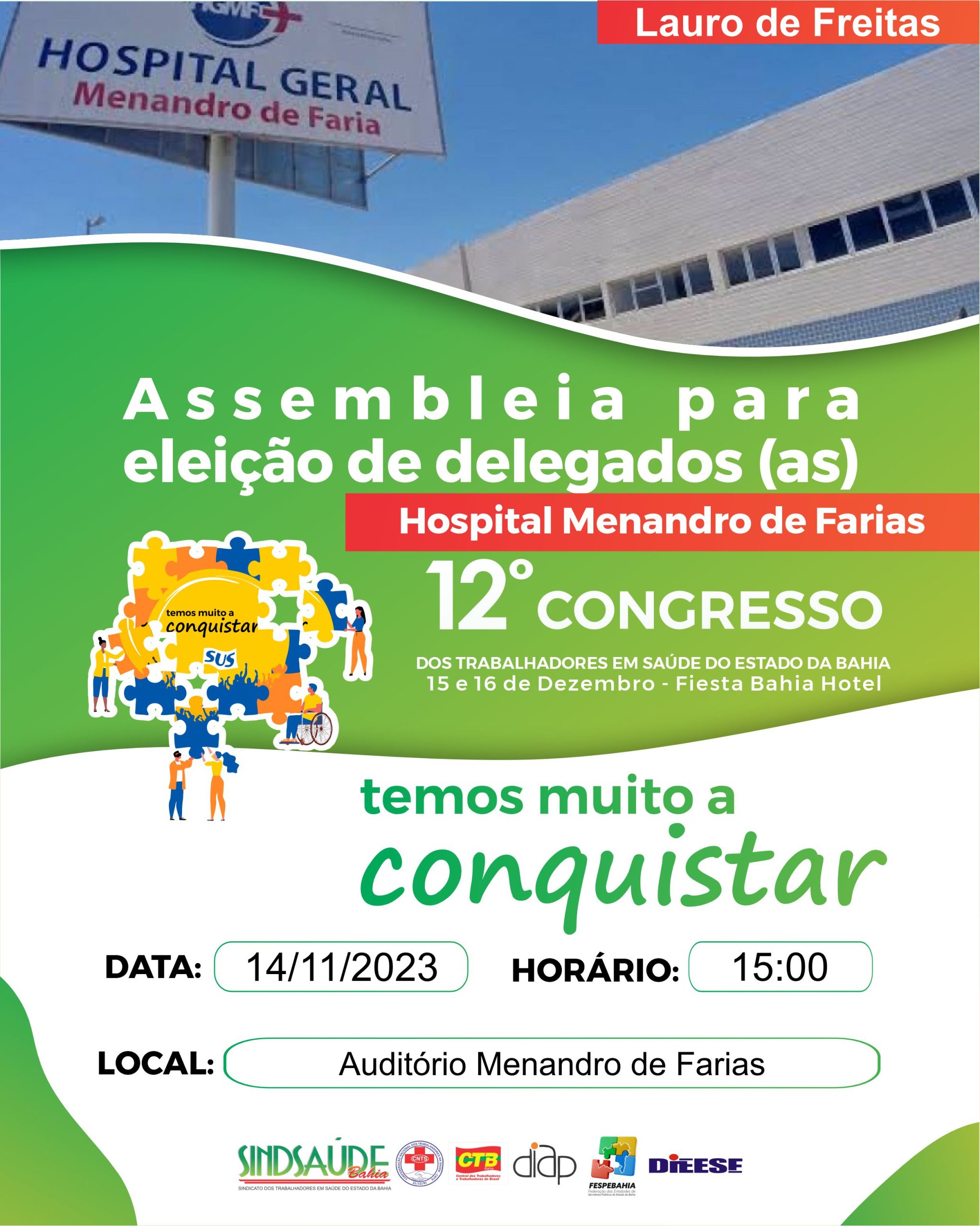 Acontece no dia 14 de novembro, no Hospital Geral Menandro de Farias, a retirada de delegados para o 12º Congresso dos Trabalhadores em Saúde do Estado da Bahia, dos aposentados da SESAB. O Congresso que é o fórum máximo de deliberação estabelecido no art. 9º do Estatuto do Sindicato dos Trabalhadores em Saúde do Estado da Bahia – SINDSAÚDE-BA. Dele, participam os Delegados ativos e aposentados, retirados (as) nas assembleias de categoria por local de trabalho e nas plenárias designadas por força do Edital de convocação, eleitos (as) conforme previsão do presente Regimento Interno (RI), aprovado pelos associados (as) em assembleia geral da categoria, especificada na Seção II, art. 19 do Estatuto supramencionado.O 12º Congresso dos Trabalhadores em Saúde do Estado da Bahia, será realizado no dia 15 e 16 de dezembro de 2023, das 08 às 18 horas, Salvador – BA, conforme edital de convocação publicado no jornal “A Tarde” em 08 de outubro do corrente ano.
