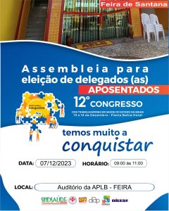Acontece no dia 07 de dezembro, no Auditório da APLB, em Feira de Santana, a retirada de delegados para o 12º Congresso dos Trabalhadores em Saúde do Estado da Bahia, dos aposentados da SESAB. O Congresso que é o fórum máximo de deliberação estabelecido no art. 9º do Estatuto do Sindicato dos Trabalhadores em Saúde do Estado da Bahia – SINDSAÚDE-BA. Dele, participam os Delegados ativos e aposentados, retirados (as) nas assembleias de categoria por local de trabalho e nas plenárias designadas por força do Edital de convocação, eleitos (as) conforme previsão do presente Regimento Interno (RI), aprovado pelos associados (as) em assembleia geral da categoria, especificada na Seção II, art. 19 do Estatuto supramencionado.
