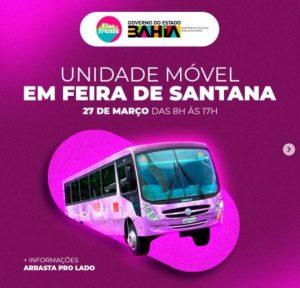 Alô, Feira de Santana! No dia 27 de março nossa unidade móvel estará chegando para oferecer atendimentos múltiplos e gratuitos para todas as feirenses.
