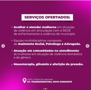 Das 8h às 17h, na UEFS, estaremos em serviço prestando acolhimento e apoio a mulheres em situação de violência, com uma equipe multidisciplinar preparada. Além de oferecer massoterapia, teste de glicemia e aferição de pressão.