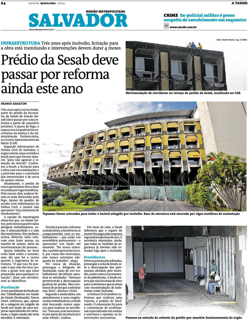 DESTAQUES A Tarde 02.08.2017: Prédio da Sesab deve passar por reforma ainda este ano 02/08/2017 por ascom Compartilhar: Share on: 0