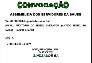 O Sindsaúde informa que o local da assembleia da próxima quinta-feira (2/10) foi transferido para o Hotel Sheraton (Antigo Hotel da Bahia), no Campo Grande, às 16h. A mudança ocorreu devido à indisponibilidade de horário na Associação dos Funcionários Públicos da Bahia na data agendada.