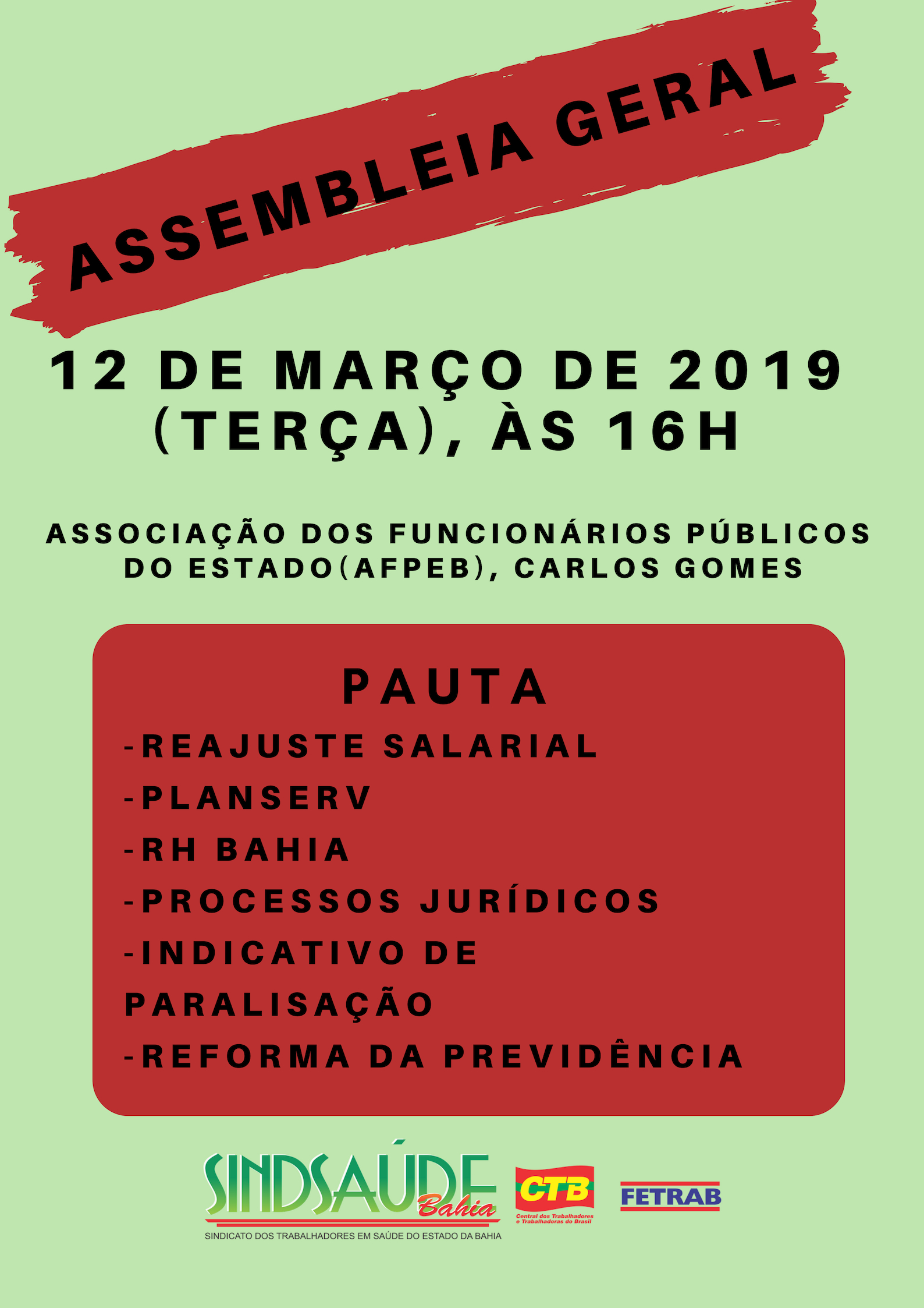 DESTAQUES Assembleia dos servidores da Saúde, 12/03, na AFPEB, às 16h. Participe! 07/03/2019 por ascom Compartilhar: Share on: 0