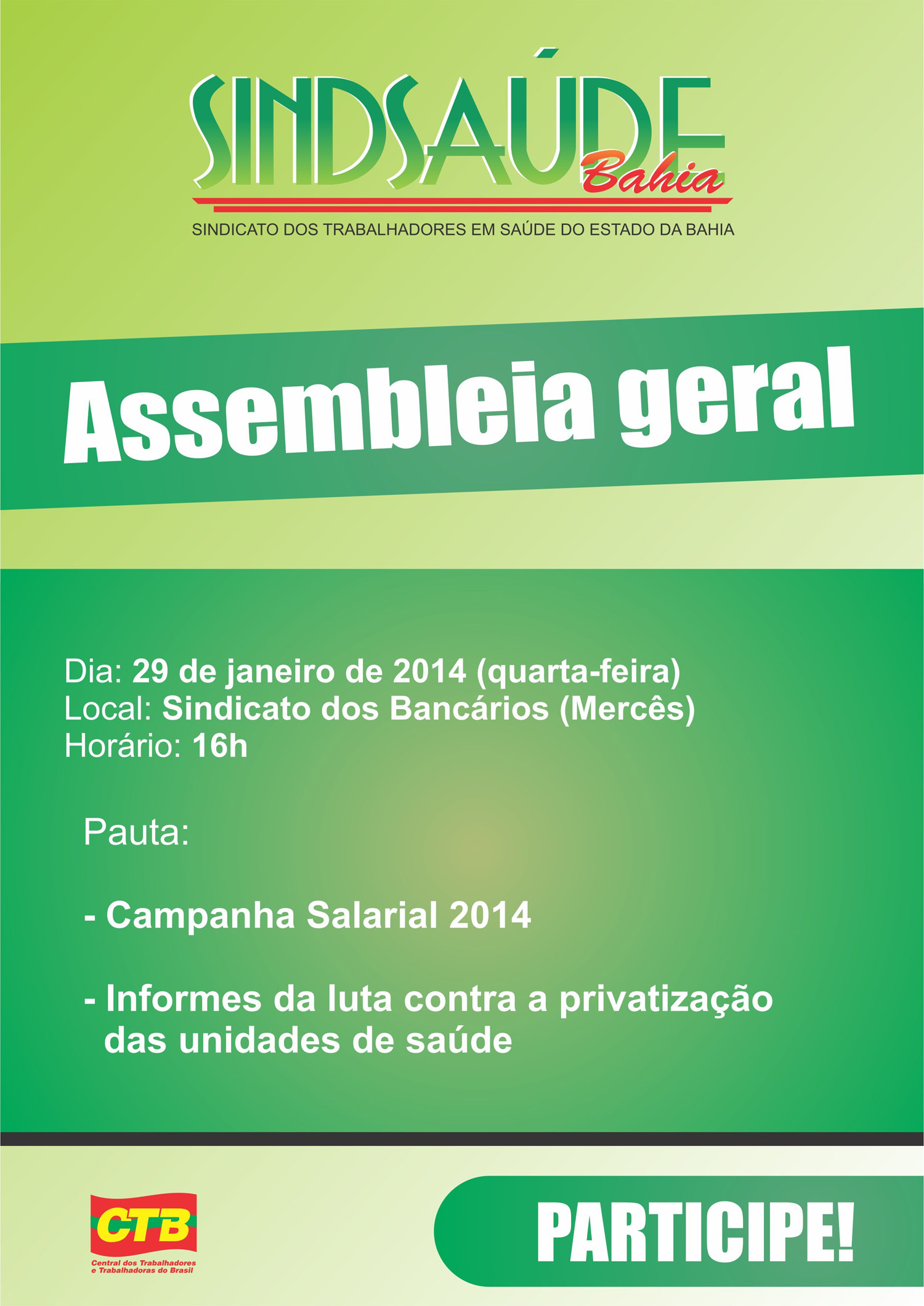 DESTAQUES Assembleia dos servidores da Saúde dia 29 (quarta-feira), às 16h 22/01/2014 por ascom 0 comentários Compartilhar: Share on: 0