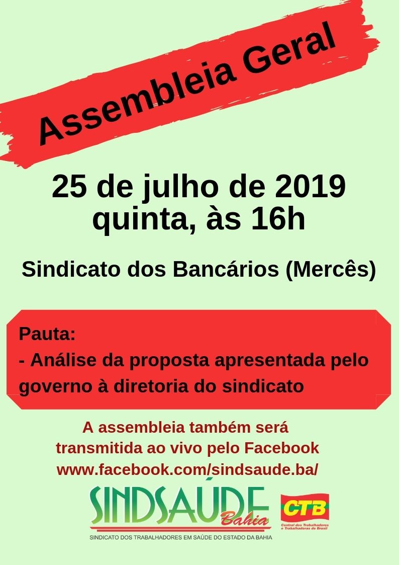 DESTAQUES Assembleia geral dos servidores da saúde dia 25/7, no sindicato dos Bancários, às 16h. Participe! 22/07/2019 por ascom os Compartilhar: Share on: 0