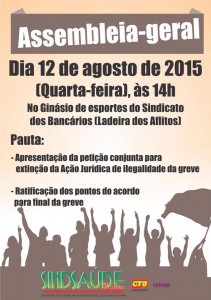 DESTAQUES ASSEMBLEIA NESTA QUARTA (12), 14H, GINÁSIO DOS BANCÁRIOS 11/08/2015 por ascom Compartilhar: Share on: 0
