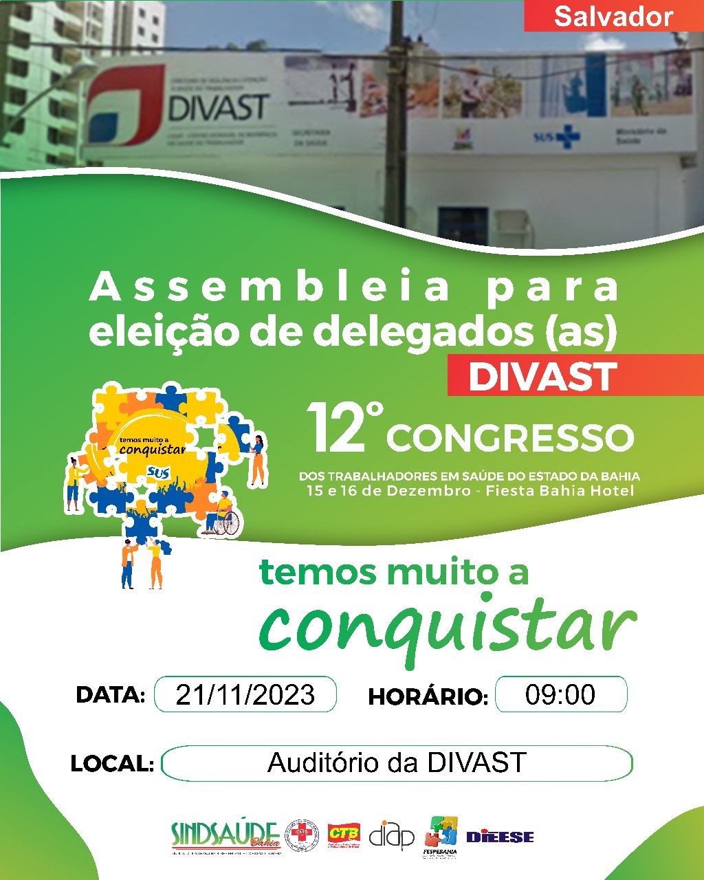 Acontece no dia 21 de novembro, a retirada de delegados para o 12º Congresso dos Trabalhadores em Saúde do Estado da Bahia que é o fórum máximo de deliberação estabelecido no art. 9º do Estatuto do Sindicato dos Trabalhadores em Saúde do Estado da Bahia – SINDSAÚDE-BA. Dele, participam os Delegados ativos e aposentados, retirados (as) nas assembleias de categoria por local de trabalho e nas plenárias designadas por força do Edital de convocação, eleitos (as) conforme previsão do presente Regimento Interno (RI), aprovado pelos associados (as) em assembleia geral da categoria, especificada na Seção II, art. 19 do Estatuto supramencionado.O 12º Congresso dos Trabalhadores em Saúde do Estado da Bahia, será realizado no dia 15 e 16 de dezembro de 2023, das 08 às 18 horas, Salvador – BA, conforme edital de convocação publicado no jornal “A Tarde” em 08 de outubro do corrente ano.