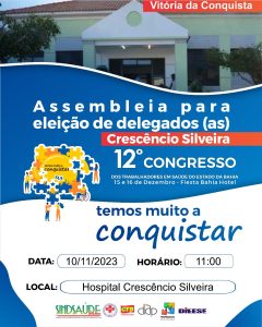 Acontece no dia 10 de novembro, a retirada de delegados para o 12º Congresso dos Trabalhadores em Saúde do Estado da Bahia que é o fórum máximo de deliberação estabelecido no art. 9º do Estatuto do Sindicato dos Trabalhadores em Saúde do Estado da Bahia – SINDSAÚDE-BA. Dele, participam os Delegados ativos e aposentados, retirados (as) nas assembleias de categoria por local de trabalho e nas plenárias designadas por força do Edital de convocação, eleitos (as) conforme previsão do presente Regimento Interno (RI), aprovado pelos associados (as) em assembleia geral da categoria, especificada na Seção II, art. 19 do Estatuto supramencionado.O 12º Congresso dos Trabalhadores em Saúde do Estado da Bahia, será realizado no dia 15 e 16 de dezembro de 2023, das 08 às 18 horas, Salvador – BA, conforme edital de convocação publicado no jornal “A Tarde” em 08 de outubro do corrente ano.