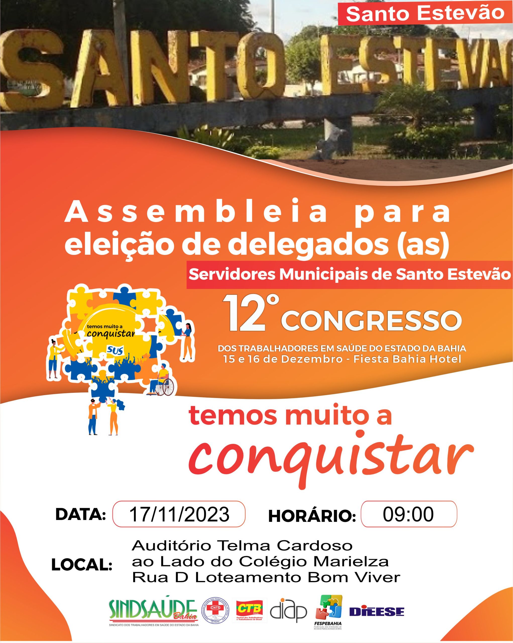Acontece no 17 de novembro, em Santo Estevão, a retirada de delegados para o 12º Congresso dos Trabalhadores em Saúde do Estado da Bahia, que é o fórum máximo de deliberação estabelecido no art. 9º do Estatuto do Sindicato dos Trabalhadores em Saúde do Estado da Bahia – SINDSAÚDE-BA. Dele, participam os Delegados ativos e aposentados, retirados (as) nas assembleias de categoria por local de trabalho e nas plenárias designadas por força do Edital de convocação, eleitos (as) conforme previsão do presente Regimento Interno (RI), aprovado pelos associados (as) em assembleia geral da categoria, especificada na Seção II, art. 19 do Estatuto supramencionado.O 12º Congresso dos Trabalhadores em Saúde do Estado da Bahia, será realizado no dia 15 e 16 de dezembro de 2023, das 08 às 18 horas, Salvador – BA, conforme edital de convocação publicado no jornal “A Tarde” em 08 de outubro do corrente ano.