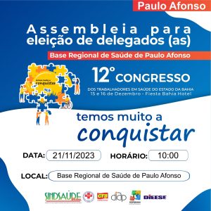 Acontece no dia 21 de novembro, na Base Regional de Saúde de Paulo Afonso, a retirada de delegados para o 12º Congresso dos Trabalhadores em Saúde do Estado da Bahia. O Congresso que é o fórum máximo de deliberação estabelecido no art. 9º do Estatuto do Sindicato dos Trabalhadores em Saúde do Estado da Bahia – SINDSAÚDE-BA. Dele, participam os Delegados ativos e aposentados, retirados (as) nas assembleias de categoria por local de trabalho e nas plenárias designadas por força do Edital de convocação, eleitos (as) conforme previsão do presente Regimento Interno (RI), aprovado pelos associados (as) em assembleia geral da categoria, especificada na Seção II, art. 19 do Estatuto supramencionado.
