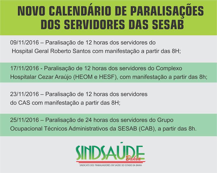 Atenção servidores da Saúde, houve uma alteração no calendário de paralisações da categoria por unidades. A inversão da data das duas últimas atividades, para que a programação seja encerrada no dia 25 de novembro com uma grande manifestação na sede da SESAB (CAB).