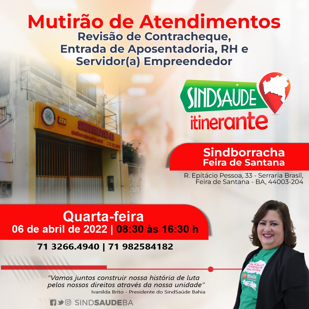 O Sindicato dos trabalhadores em saúde do Estado da Bahia nesta quarta-feira, 06 de abril, o projeto SindsaúdeBa Itinerante estará na sede do SindBorracha, no endereço: R. Epitácio Pessoa, 33 – Serraria Brasil, em Feira de Santana – BA.