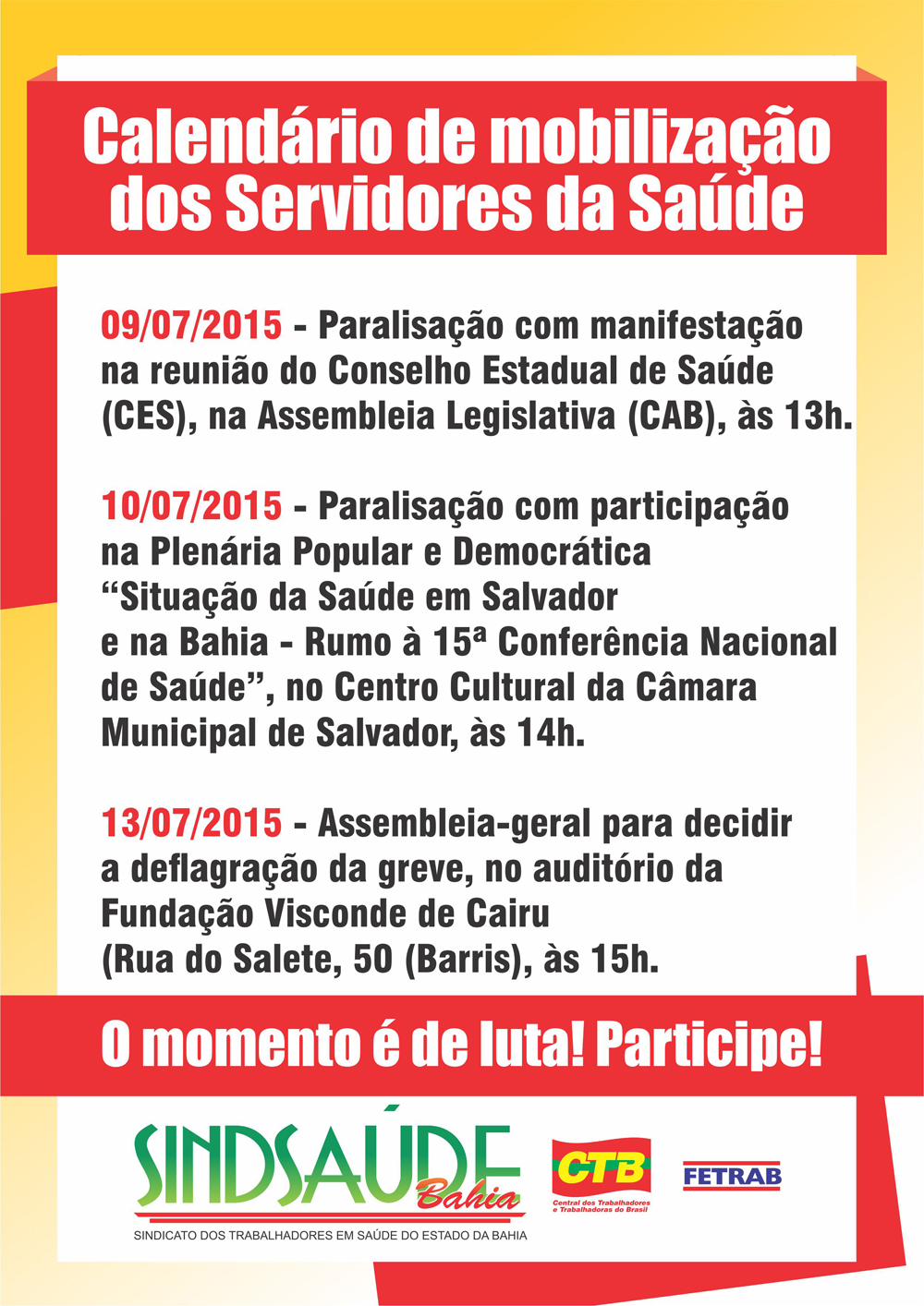 DESTAQUES Calendário de mobilização dos servidores da Saúde 07/07/2015 por ascom 0 comentários Compartilhar: Share on: 0