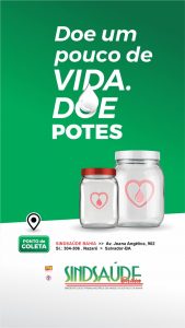 O SindSaúde-BA através das Diretorias de Esporte e Lazer e Comunicação, iniciam nesta terça-feira, 25 de maio, a campanha “Doe um Pouco de Vida, Doe Potes” para arrecadar potes de vidro para os Bancos de Leite na Bahia. O objetivo é fortalecer as campanhas no Estado, onde há servidores públicos da saúde.