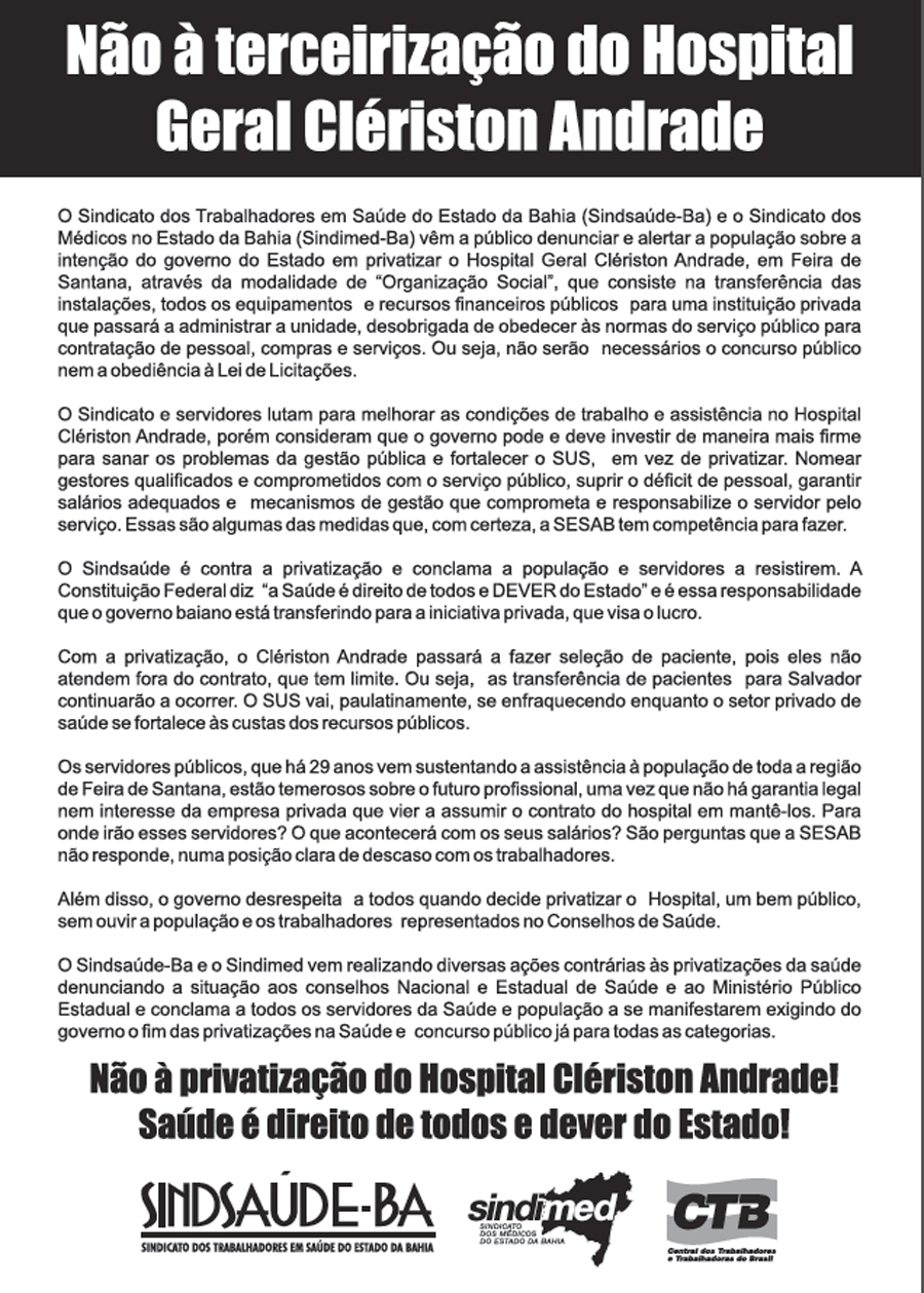 DESTAQUES Sem categoria Carta aberta à população: Não à terceirização do HGCA 01/03/2013 por ascom 0 comentários Compartilhar: Share on: 0