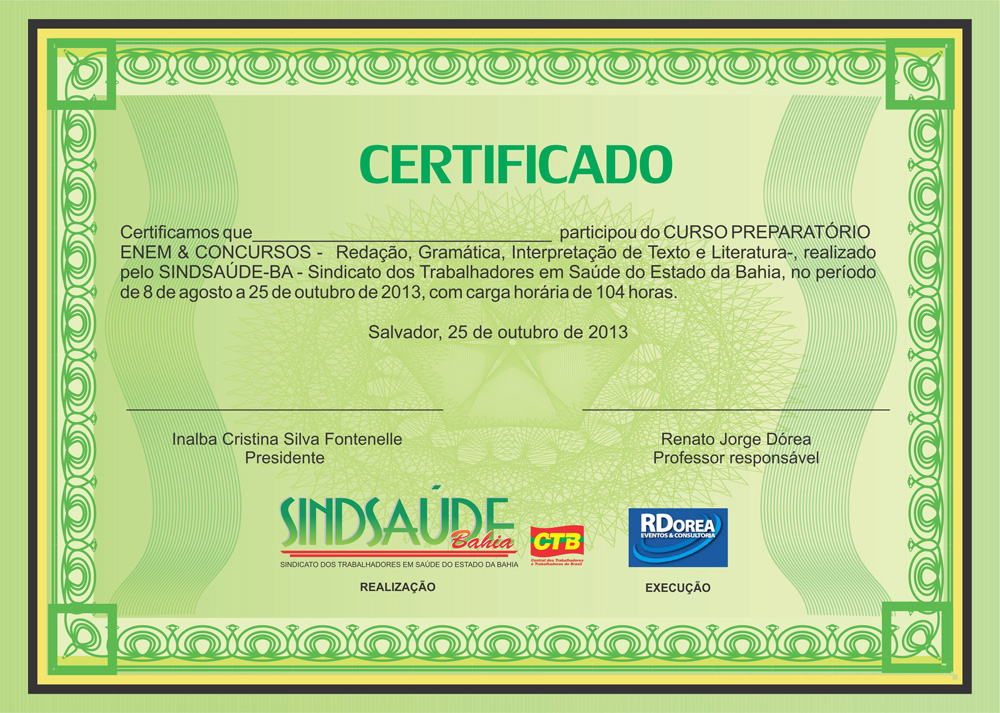 Os certificados de conclusão do curso de Linguagens, Códigos e suas Tecnologias, preparatório para as provas do ENEM, promovido pelo Sindsaúde, serão entregues nesta sexta-feira (22), a partir das 11h, durante o IV Encontro dos Auxiliares e Técnicos Administrativos da Sesab. Terão direito ao certificado somente aqueles alunos que obtiveram acima de 60 % de frequência. O evento será realizado no Sol Barra Hotel, na Avenida Sete de Setembro, número 3577, Porto da Barra, em Salvador.