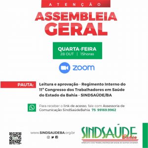 Pela primeira vez em 31 anos, o SindSaudeBahia realiza a Assembleia Geral em formato digital, nesta quarta-feira, 28 de outubro, às 15 horas. O fato inédito é decorrente do distanciamento social provocado pela pandemia do novo coronavírus. A alternativa é reunir os servidores públicos da saúde do Estado da Bahia, através da plataforma zoom, para leitura e aprovação junto com todos sobre o 11 Congresso SindSaúdeBahia. Na pauta: leitura e aprovação Regimento Interno do XI congresso dos trabalhadores em Saúde do Estado da Bahia.