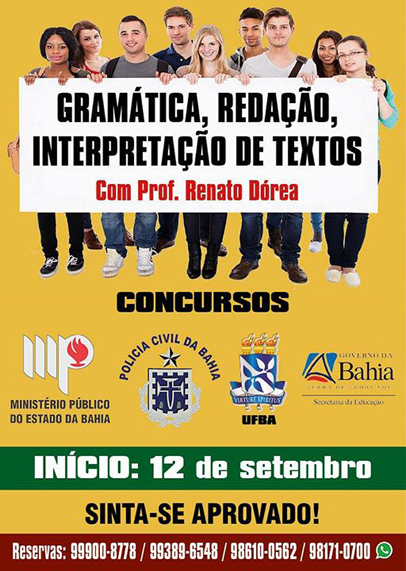 Através de uma parceria com a RDOREA Consultoria e Eventos, os associados do Sindsaúde-BA, cônjuges e seus dependentes diretos poderão obter desconto de 40% no curso de português para Enem e concursos promovido pelo professor Renató Dórea. Serão ministradas as disciplinas de Gramática, Interpretação de Texto e Redação.