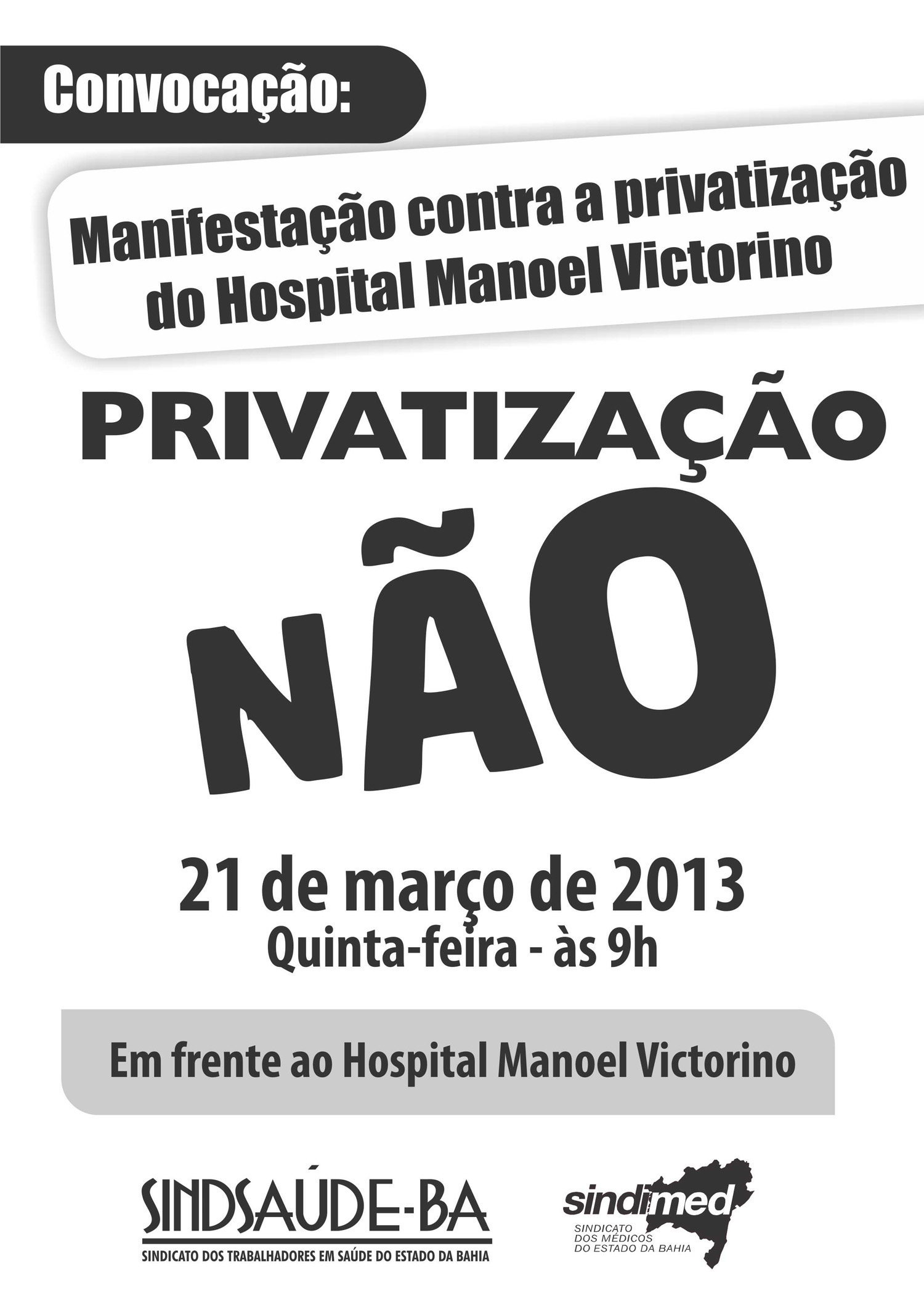 DESTAQUES Manifestação contra privatização do H. Manoel Victorino nesta quinta (21) 19/03/2013 por ascom 0 comentários Compartilhar: Share on: 0
