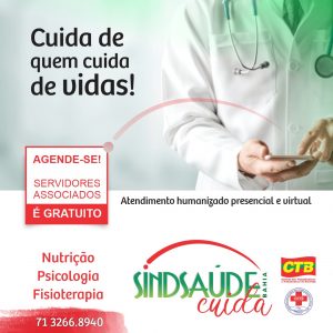 O SindSaúdeBahia ampliando as propostas de combater todas as perdas dos direitos e pensando em cuidar da saúde dos colegas servidores da Bahia, inicia nesta segunda-feira, 26 de abril de 21, o SindSaúde Bahia Cuida, uma inciativa piloto com três linhas de atendimento neste primeiro momento: nutrição, psicóloga fisioterapia para os associados. O objetivo é reaproximar e cuidar dos colegas servidores que somos a fortaleza da economia do Estado da Bahia e, mesmo assim, estão sobre fortes ataques.