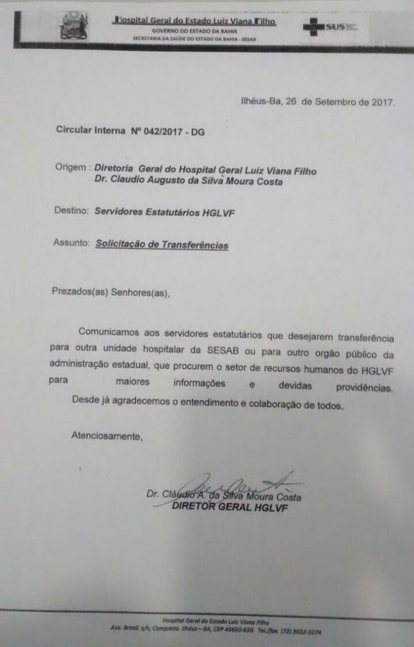 Após inúmeras cobranças do Sindsaúde por uma posição da diretoria do Hospital Regional Luiz Viana Filho, em Ilhéus, sobre o processo de municipalização da unidade, os servidores foram surpreendidos, no dia 26 de setembro, com uma Circular do diretor do hospital, Cláudio Augusto da Silva Moura Costa, que orienta os profissionais a solicitarem transferência para outras unidades hospitalares da Sesab.