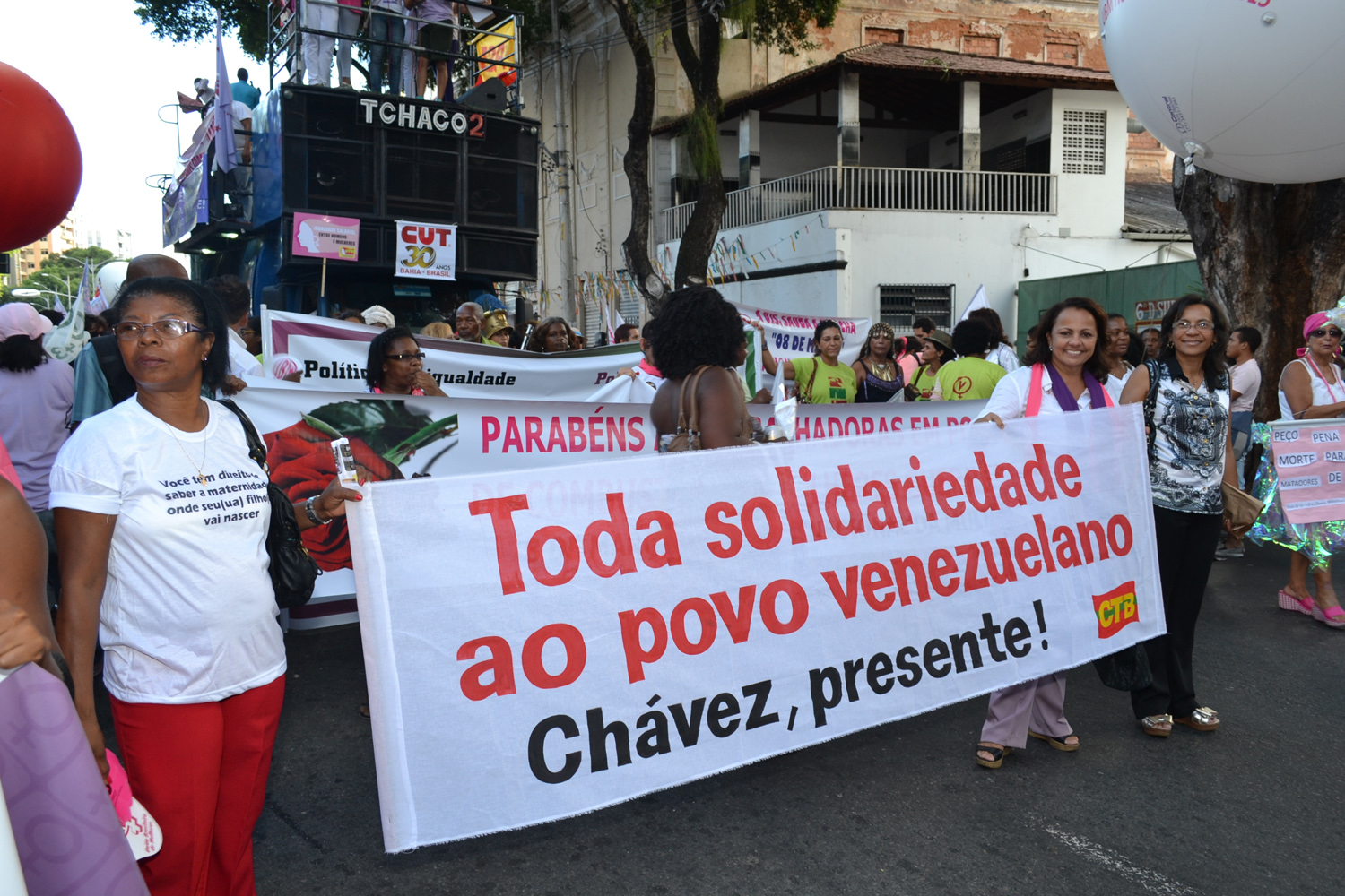Centenas de sindicalistas e trabalhadoras participaram da Caminhada pelo Dia Internacional da Mulher, na tarde de sexta-feira. A marcha saiu por volta das 16h, o Campo Grande, percorrendo o centro das ruas de Salvador, em direção à Praça castro Alves. Com o tema: “Mulheres Unidas pela Promoção da Igualdade em Todos os Espaços”, a caminhada foi promovida pela CTB, Sindsaúde-Ba e outros sindicatos, com o objetivo de dar visibilidade à luta da mulher, no sentido de fortalecer sua representatividade na instância sindical e reforçar a defesa de suas bandeiras na sociedade.