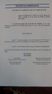 A Secretaria de Saúde da Bahia (SESAB) publicou, nesta quarta-feira, 14/10, o Governo do Estado da Bahia, decreta, através do ARt1ª – Ficam revogados o art 2º do Decreto nº 19.529, de 16 de março de 2020, que suspendia as férias e licença prêmio dos servidores públicos da saúde.