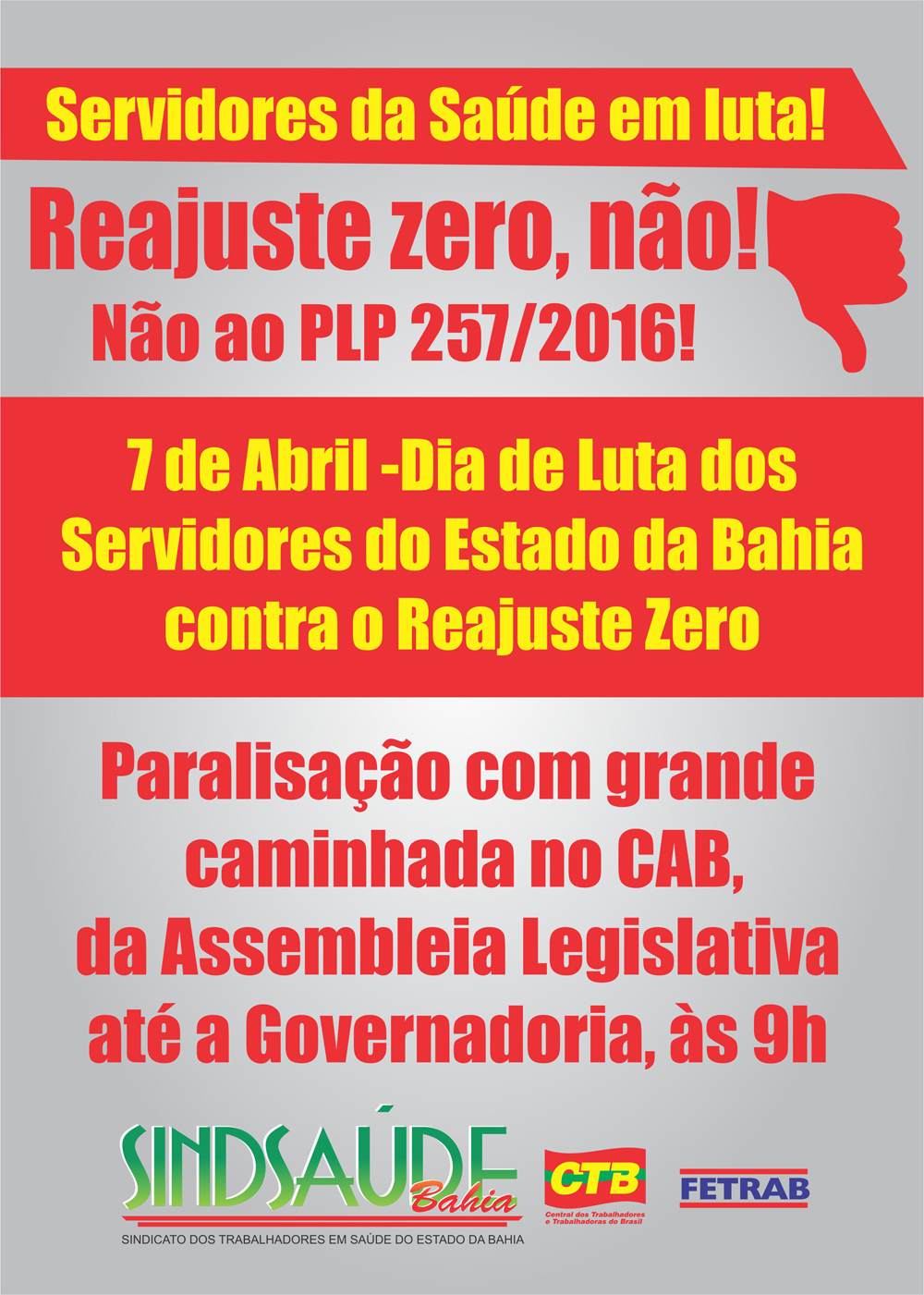 AGENDA Dia de Luta dos Trabalhadores Públicos do Estado da Bahia contra o Reajuste Zero 11/04/2016 por ascom Compartilhar: Share on: 0