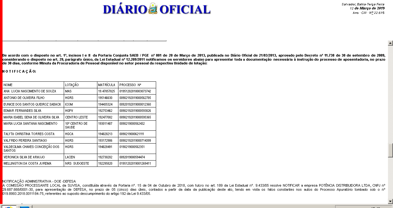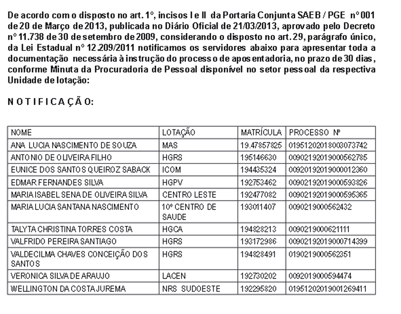 O Diário Oficial do Estado publicou nesta terça-feira, 12 de março, lista de servidores que encontram-se com pendências para conclusão do processo de aposentadoria. Os trabalhadores têm o prazo de 30 dias para apresentar toda a documentação necessária à instrução do processo de aposentadoria, conforme Minuta da Procuradoria de Pessoal disponível no setor pessoal da respectiva Unidade de lotação.