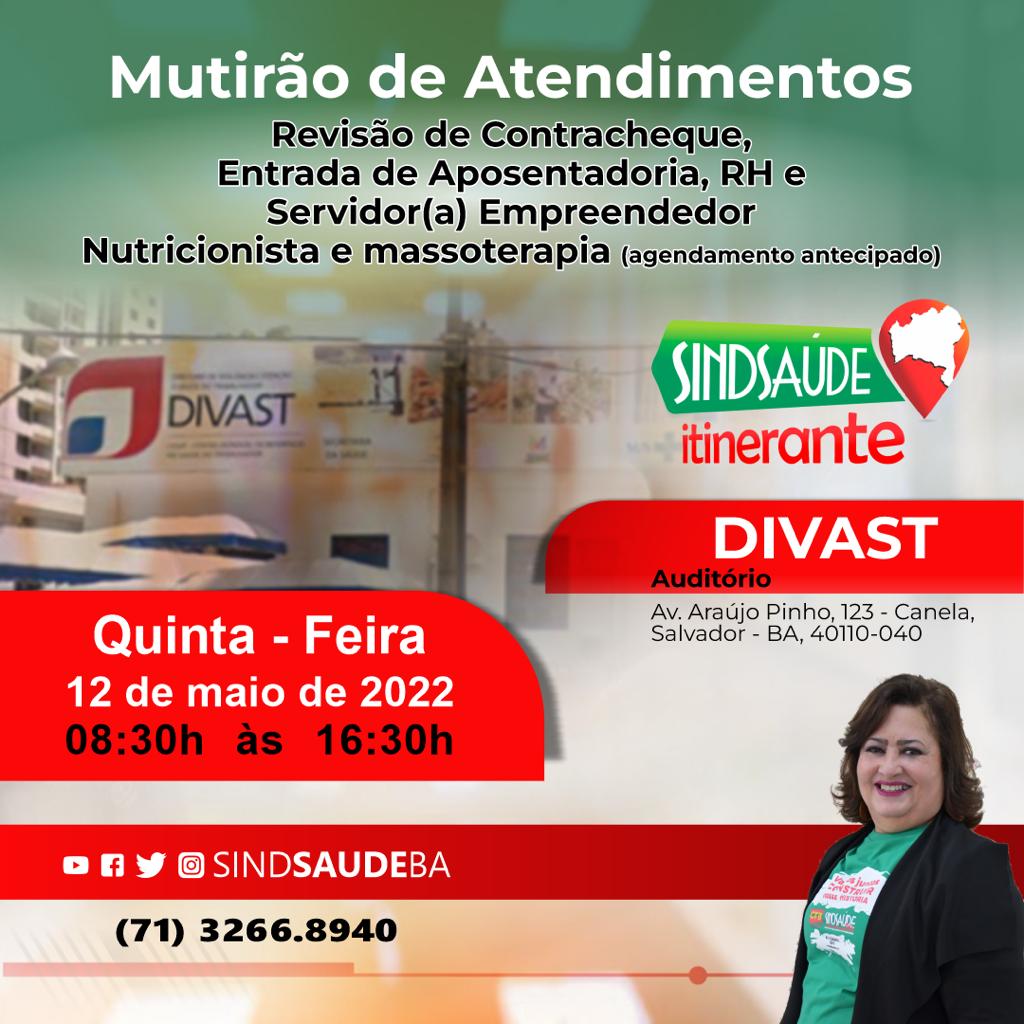 Nos próximos dia 12 de maio, quinta-feira, o Sindsaúde Bahia Itinerante vai estar na DIVAST (Diretoria de Vigilância e Atenção à Saúde do Trabalhador),