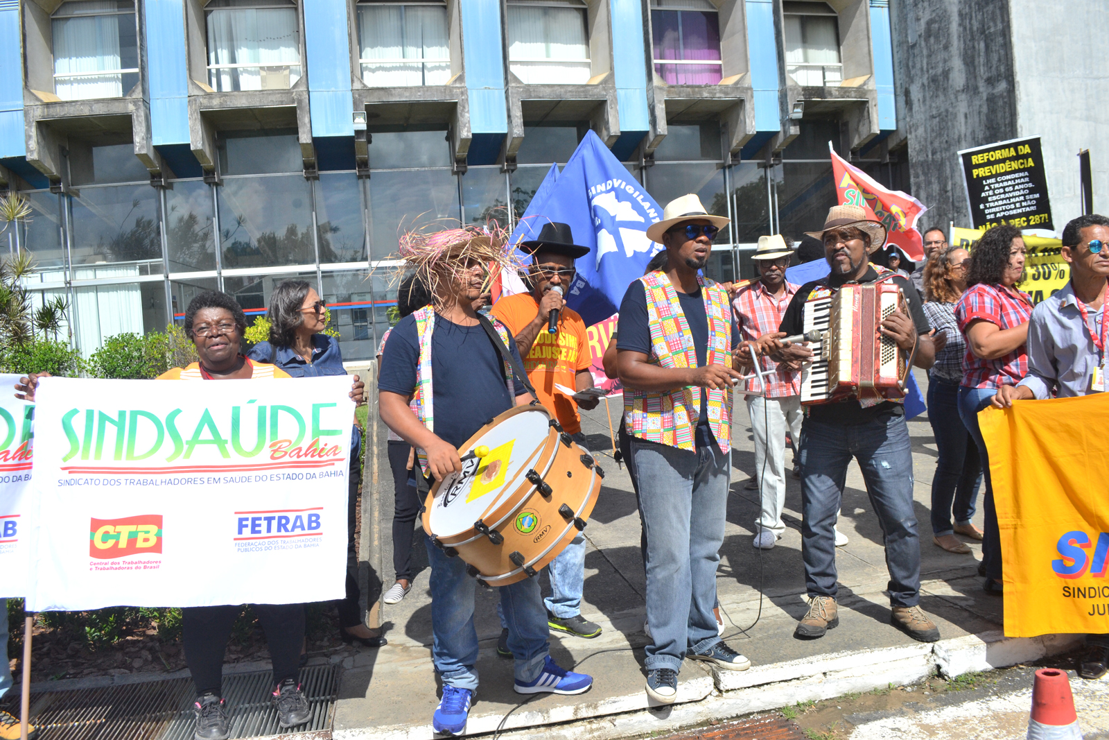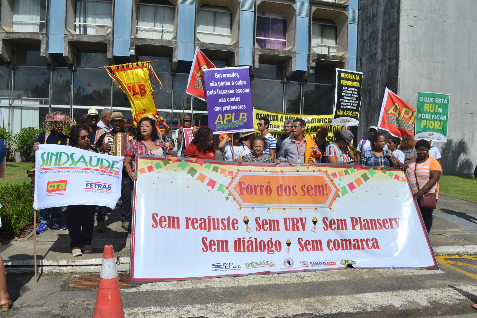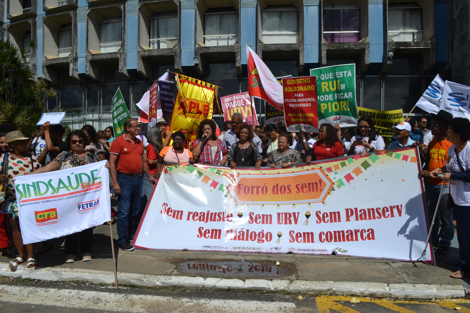 Ao som de forró pé de serra, servidores da saúde e de diversas categorias do funcionalismo público estadual protestaram contra a postura intransigente do governador Rui Costa no Forró dos Sem, realizado em frente à Secretaria da Administração do Estado, no CAB, nesta quinta-feira (13/06). Promovido pelo Movimento Unificado de Entidades do Funcionalismo Público Estadual, formado pelo Sindsaúde, Sindsefaz, Sinpojud, Aplb Sindicato e Sintest, o forró contou também com a apresentação de um trio nordestino e comidas típicas