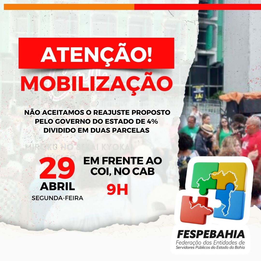 Diante de falta de qualquer possibilidade de negociação de um novo percentual, por parte do governo, os representantes dos sindicatos decidiram pela realização de uma nova mobilização, marcada para o dia 29 de abril, próxima segunda-feira, a partir de 9h, em frente a sede do Centro de Operações e Inteligência de Segurança Pública 2 de Julho, COI, no Centro Administrativo da Bahia (CAB).
