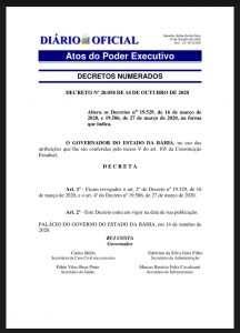 Diante do exposto, venho pelo presente dar ciência acerca do Decreto n.º 20.058 de 14/10/2020, publicado no Diário Oficial do Estado da Bahia na presente data, que revoga o art. 2º do Decreto nº 19.529/2020 e o art. 4º do Decreto nº 19.586/2020, que suspendiam, por tempo indeterminado, as férias e licenças estatutárias passíveis de gozo oportuno dos servidores públicos estaduais que atuam nos serviços públicos essenciais, bem como do Ofício Circular SUPERH n° 33/2020, através do Processo SEI n° 019.5348.2020.0115886-02.