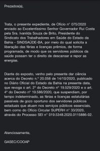 O Governo do Estado da Bahia reconhecendo a importância e necessidade das férias e licença prêmio para os Servidores Públicos da Saúde, após solicitação de ofício encaminhado pela presidente do SindSaúdeBahia, Ivanilda Brito.