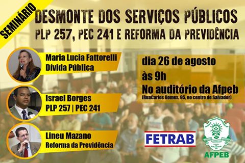 OUTRAS NOTÍCIAS Fetrab promove seminário "Desmonte dos Serviços Públicos", dia 26 22/08/2016 por ascom Compartilhar: Share on: 0