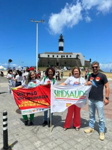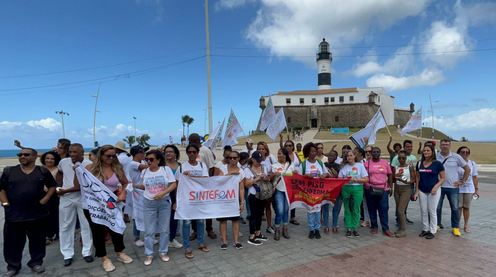 Na manhã desta terça-feira (10), a luta pelo pagamento correto do Piso Salarial da Enfermagem ganhou mais um capítulo importante. Uma manifestação no Farol da Barra, em Salvador, reuniu diretores do Sindsaúde Bahia e servidores públicos da saúde, além de enfermeiros, técnicos e auxiliares de enfermagem e diversas entidades na luta pelo pagamento do piso da enfermagem integral.