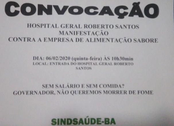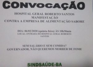 O SindsaudeBa, nesta quinta-feira, 6 de Fevereiro de 2020, realizou com a secretária Geral, Inalba Fontinele e outros diretores e servidores públicos e terceirizados do Hospital Geral Roberto Santos, uma manifestação contra a empresa SABORE de alimentação, que era para dar assistência a toda a estrutura do Hospital.