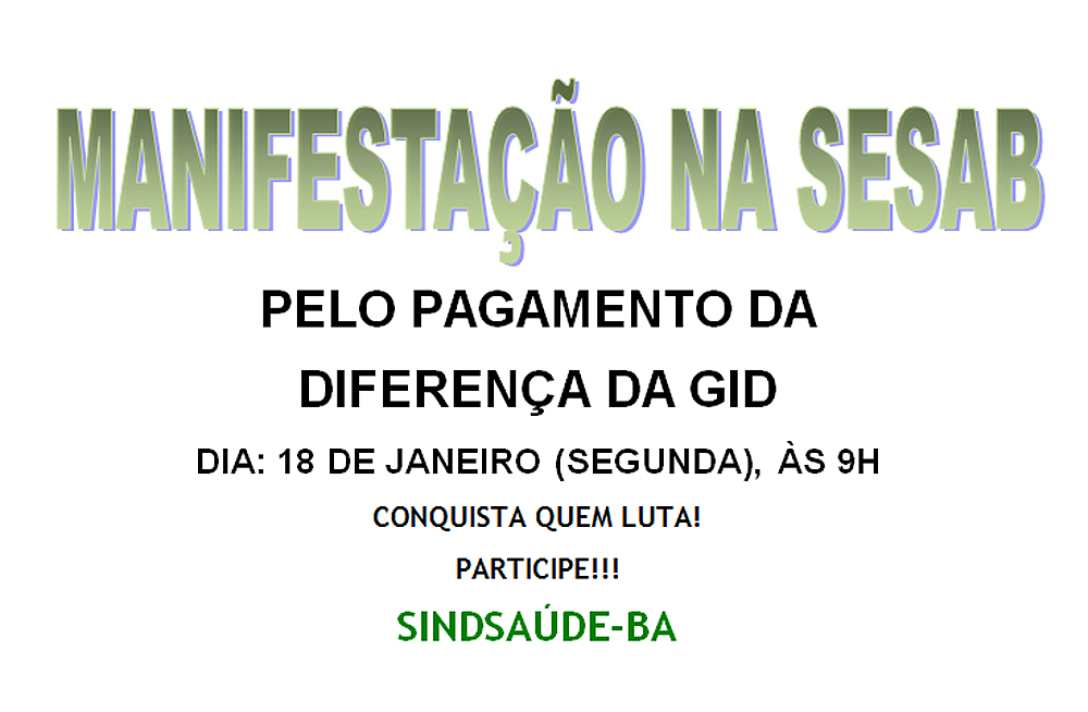 Diante do descaso e do desrespeito do governo, o Sindsaúde convoca todos os servidores que tiveram a GID cortada indevidamente, cerca de 4 mil trabalhadores, para comparecerem a manifestação em frente à Sesab, na próxima segunda-feira (18/01), às 9h, data do fechamento da folha do mês de janeiro. Vamos exigir respeito e que nossos direitos não sejam violados.