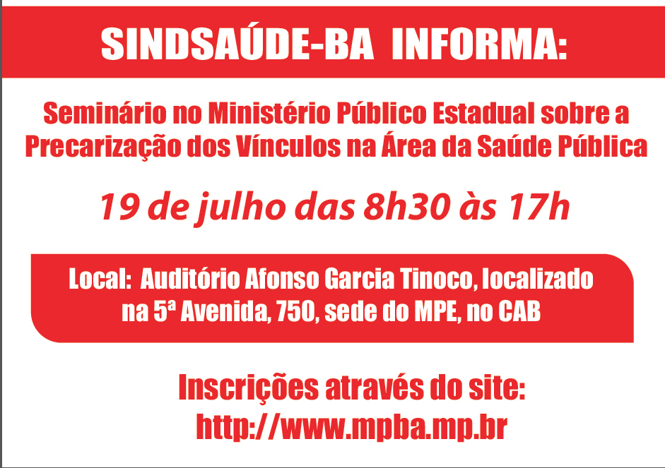 O tema do seminário é resultado das diversas audiências realizadas no MPE, solicitadas pelo Sindsaúde-Ba, servidores, movimentos sociais e outras entidades, na tentativa de questionar a política de privatização implantada pelo governo estadual, e resolver impasses trabalhistas na saúde pública. O sindicato alerta sobre a importância da participação dos trabalhadores e dos representantes de movimentos sociais no seminário que tratará de importantes esclarecimentos para os servidores do setor saúde. Inscrições através do site http://www.mpba.mp.br