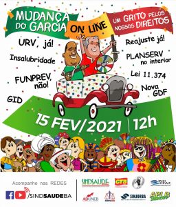 A Live do Mudança do Garcia Online está marcada para acontecer no dia 15 de fevereiro, ao meio dia, e vai poder ser vista via Facebook e Youtube do SindSaúdeBA.