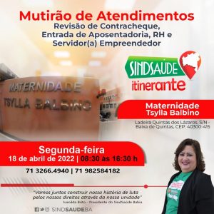 Nesta segunda-feira, 18 de abril, o atendimento será na Maternidade Tsylla Balbino, com Mutirão SindsaúdeBa realizando: Declaração do Imposto de Renda, Revisão ContraCheque, Orientações para Aposentadoria e informações diversas sobre a vida laboral dos servidores públicos da saúde.