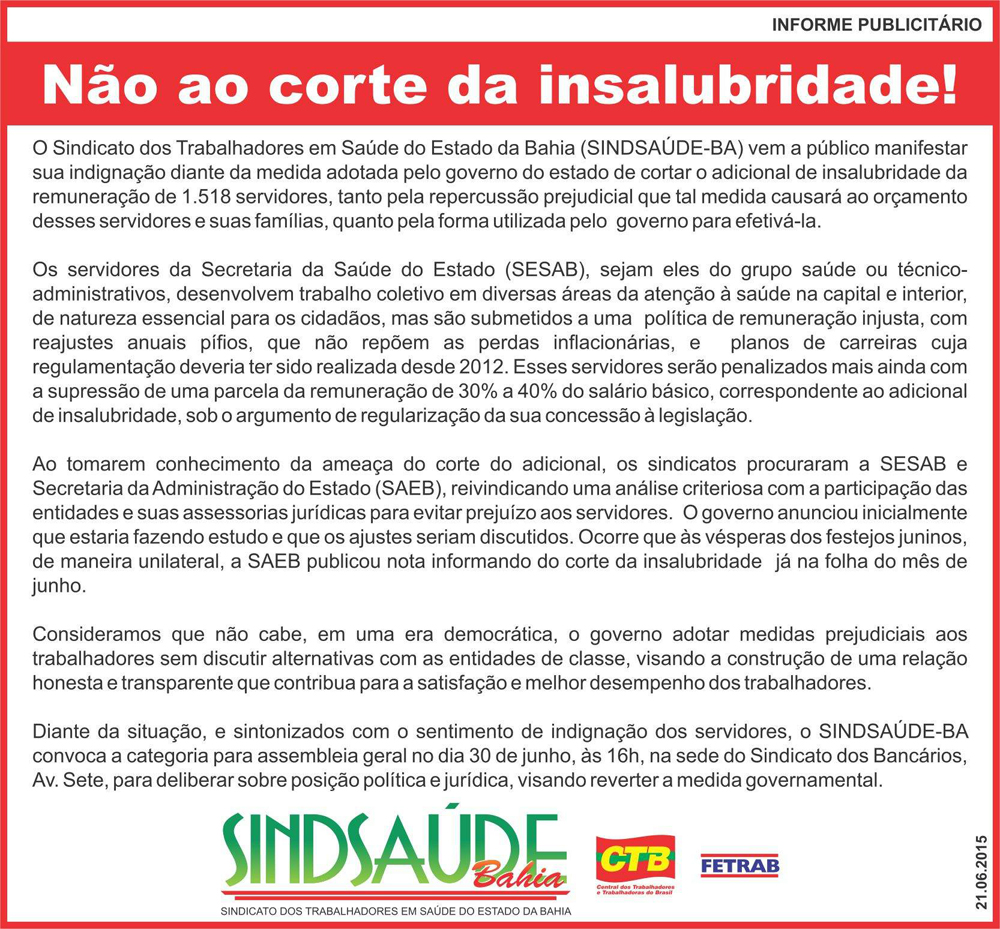 DESTAQUES Nao ao corte da insalubridade! 20/06/2015 por ascom 0 comentários Compartilhar: Share on: 0