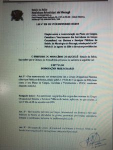 Como as três etapas foram conclusiva graças a esforço juntos do SindsaúdeBa, em especial o RH e Advogados, o relatório de impacto financeiro e a Tabela Salarial dos Servidores da Saúde foram encaminhados a Câmara de Vereadores e aprovados. De acordo com Secretária de Saúde, Junior Douglas. “Após esse processo, a lei já entra em vigor”, como se confirmou através do diário oficial em anexo nesta matéria.