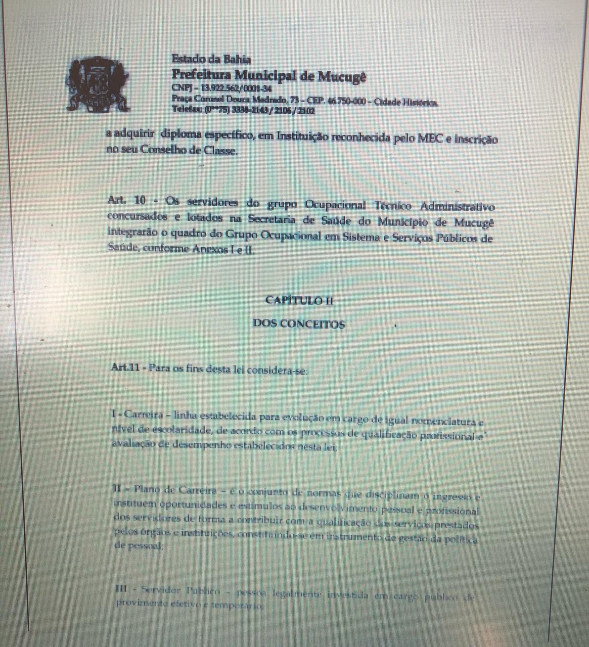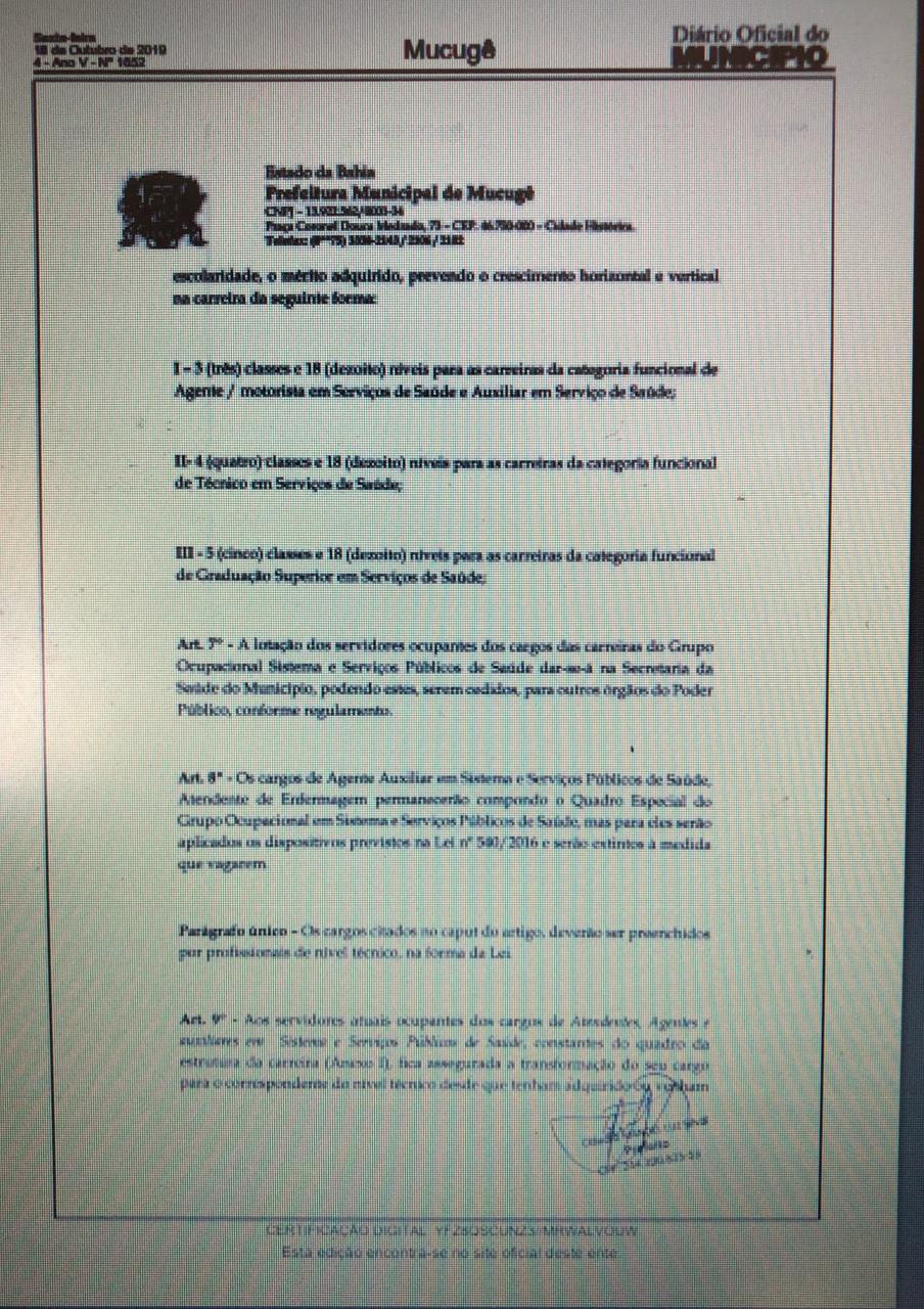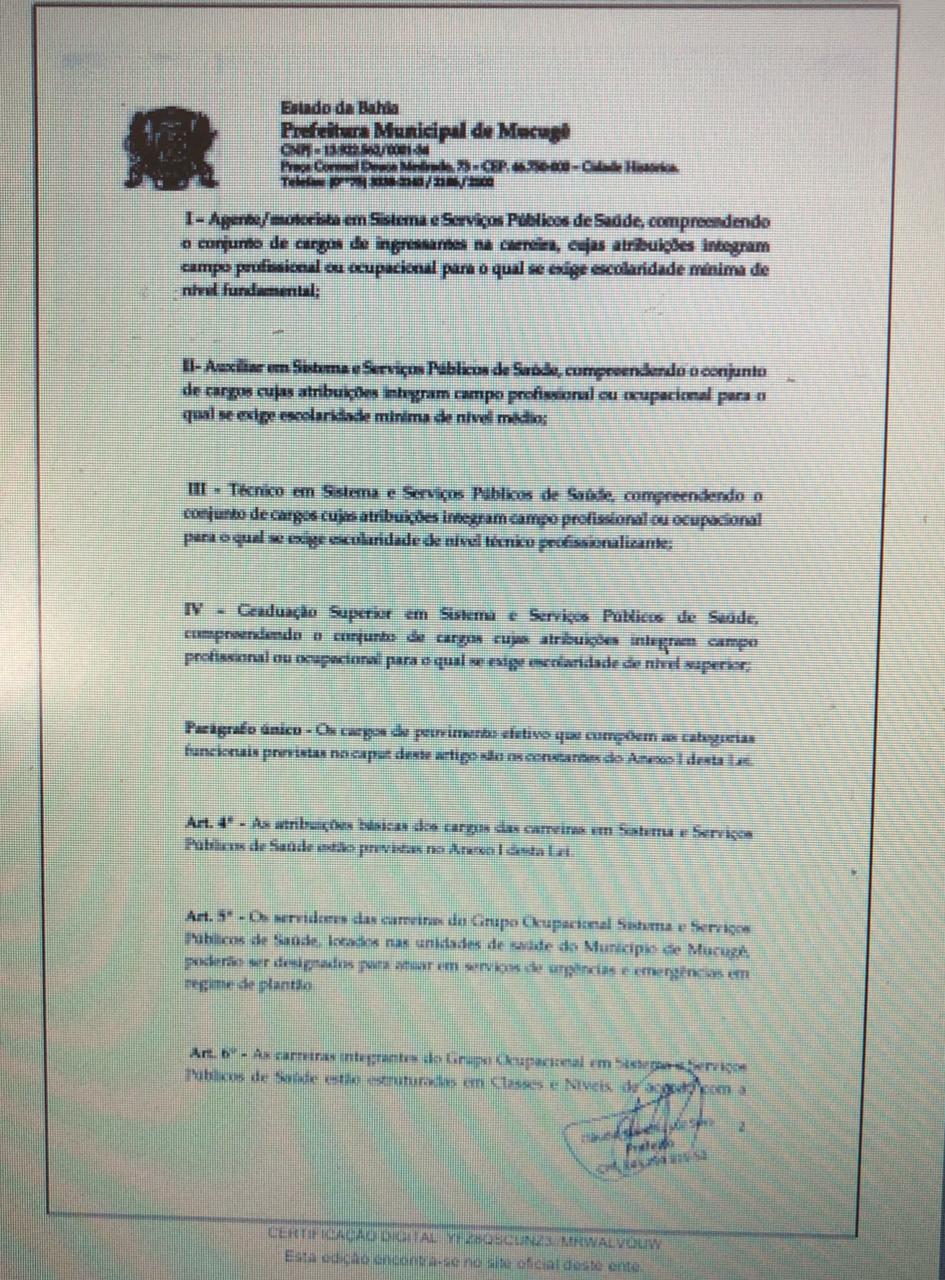 Em dezembro de 2018, foi protocolado no gabinete do prefeito um ofício com o objetivo de saber o que estava havendo em relação ao acordo não cumprido de apresentar a Tabela Salarial dos Servidores da Saúde à Câmara Municipal de Mucugê para dar início a implementação do PCCV da categoria. “A comissão cobrou oficialmente justificativa e posição definida do Executivo sobre a tabela atualizada que não foi apresentada”, disse a vereadora Núbia Sacerdote (PSB) entrou na luta, junto com as categorias envolvidas.