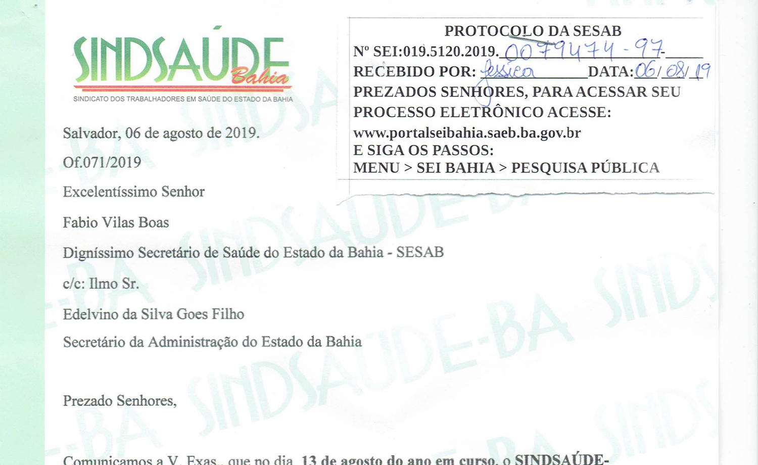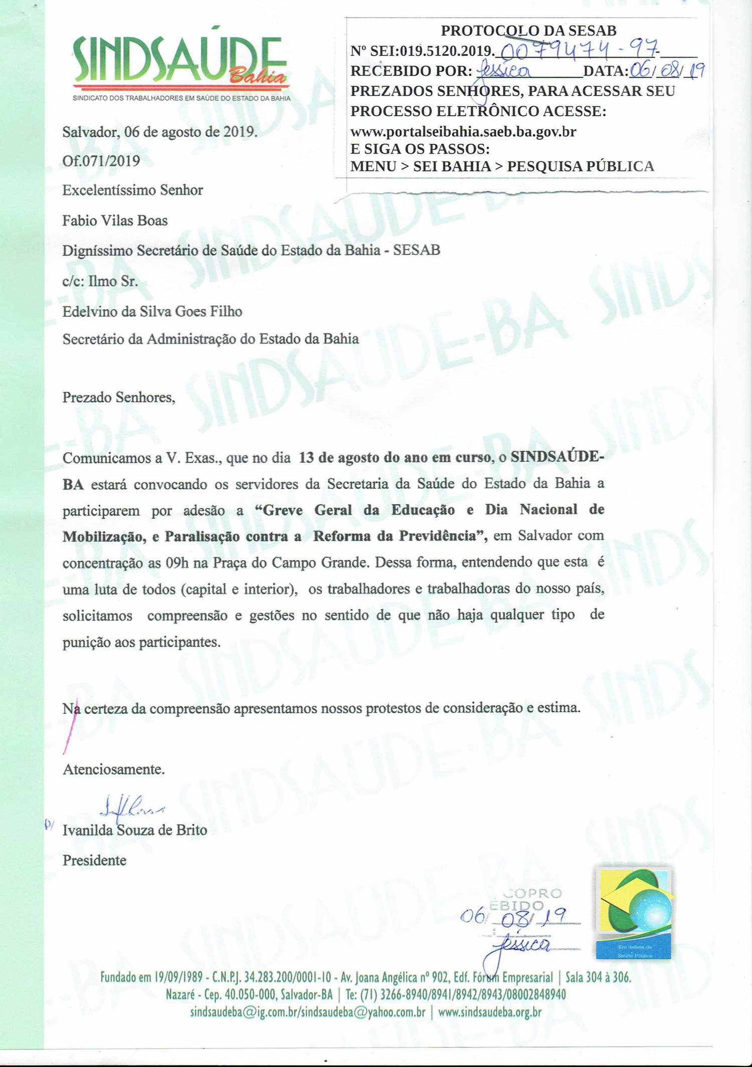 Ofício comunicando governo sobre adesão dos servidores na greve geral em defesa da educação e contra reforma da previdência