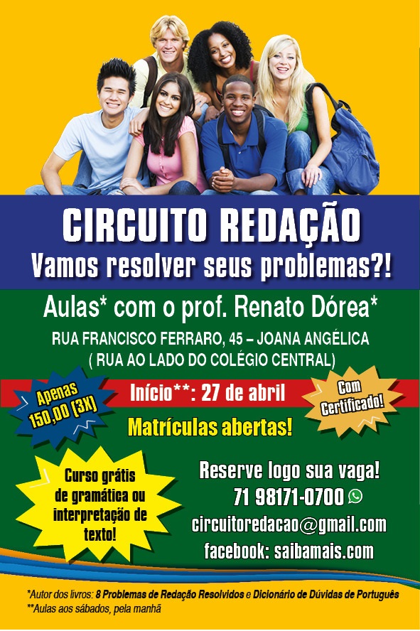 Através de uma parceria, os associados do Sindsaúde-BA, cônjuges e seus dependentes diretos poderão obter desconto de 25% no Circuito de Redação, promovido pelo professor Renató Dórea. O curso é destinado àquelas pessoas que estão se preparando para concursos, vestibular, Enem ou desejam melhorar a redação para o ambiente de trabalho.