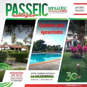 Uma turma alegre e cheia de energia se reúnem no próximo dia 14 de dezembro, na primeira edição do Passeio Ecológico SindSaúde BA, com saída às 06:00 horas e retorno às 16 horas, do Hotel Fazenda Ecoville. o objetivo do passeio é interação, com melhor qualidade de vida e melhorar as relações interpessoais.